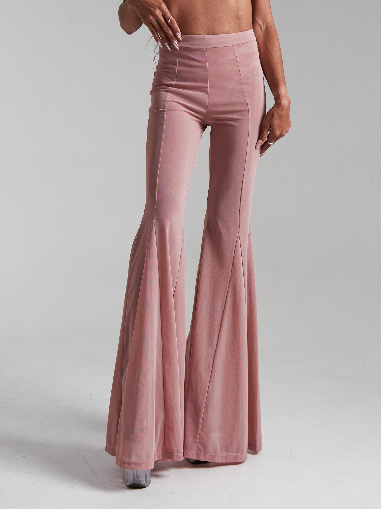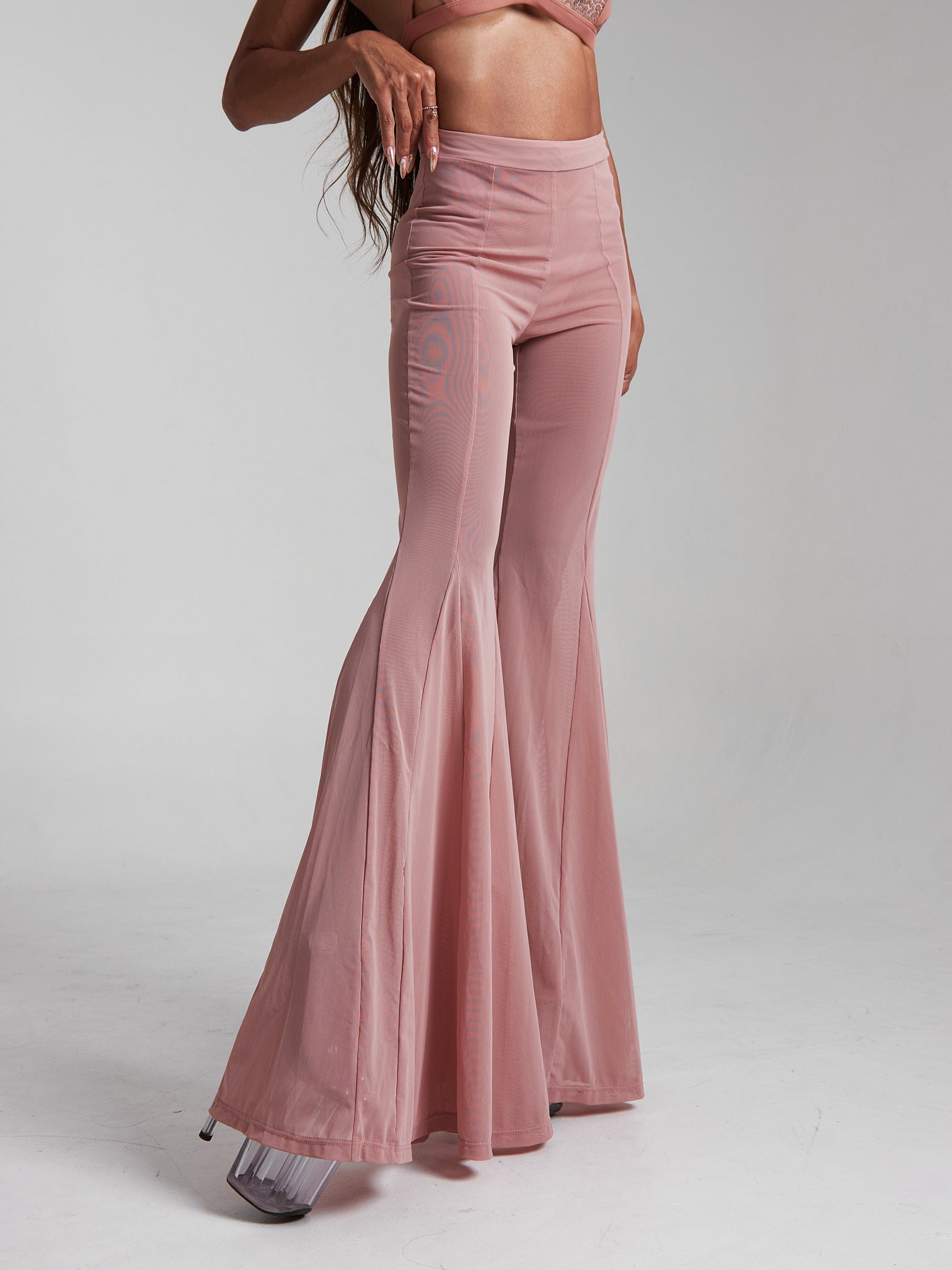 Meet your new polewear essential — ultra-soft flared pants crafted from high-quality, stretchy mesh that feels like a second skin. Half-sheer and breathable, they hug your curves and flow with every move. Featuring a flattering high waist, full flare for dramatic lines, and a cut that partly covering dancing shoe. Designed for confidence, comfort, and effortless style — on and off the pole.