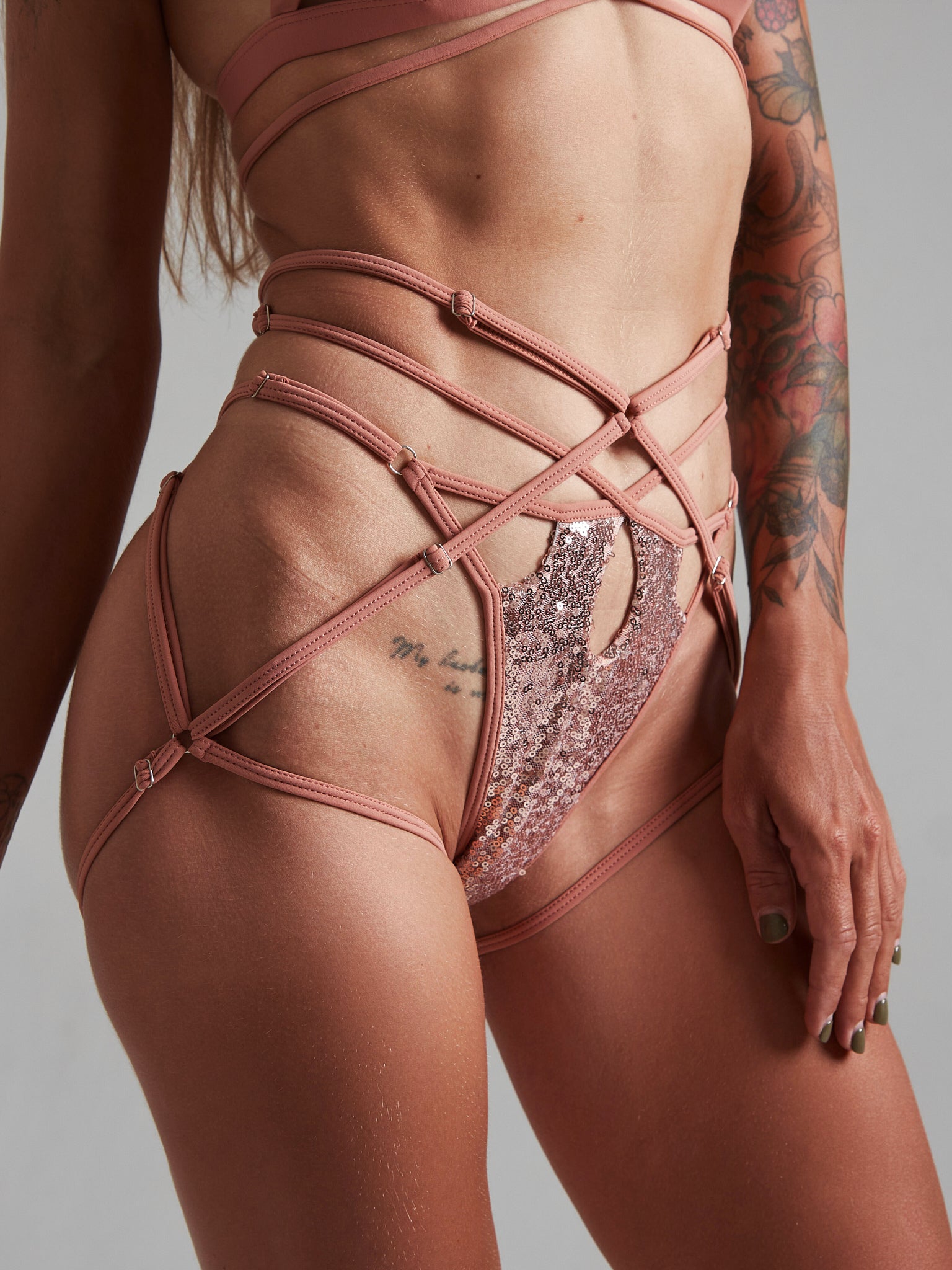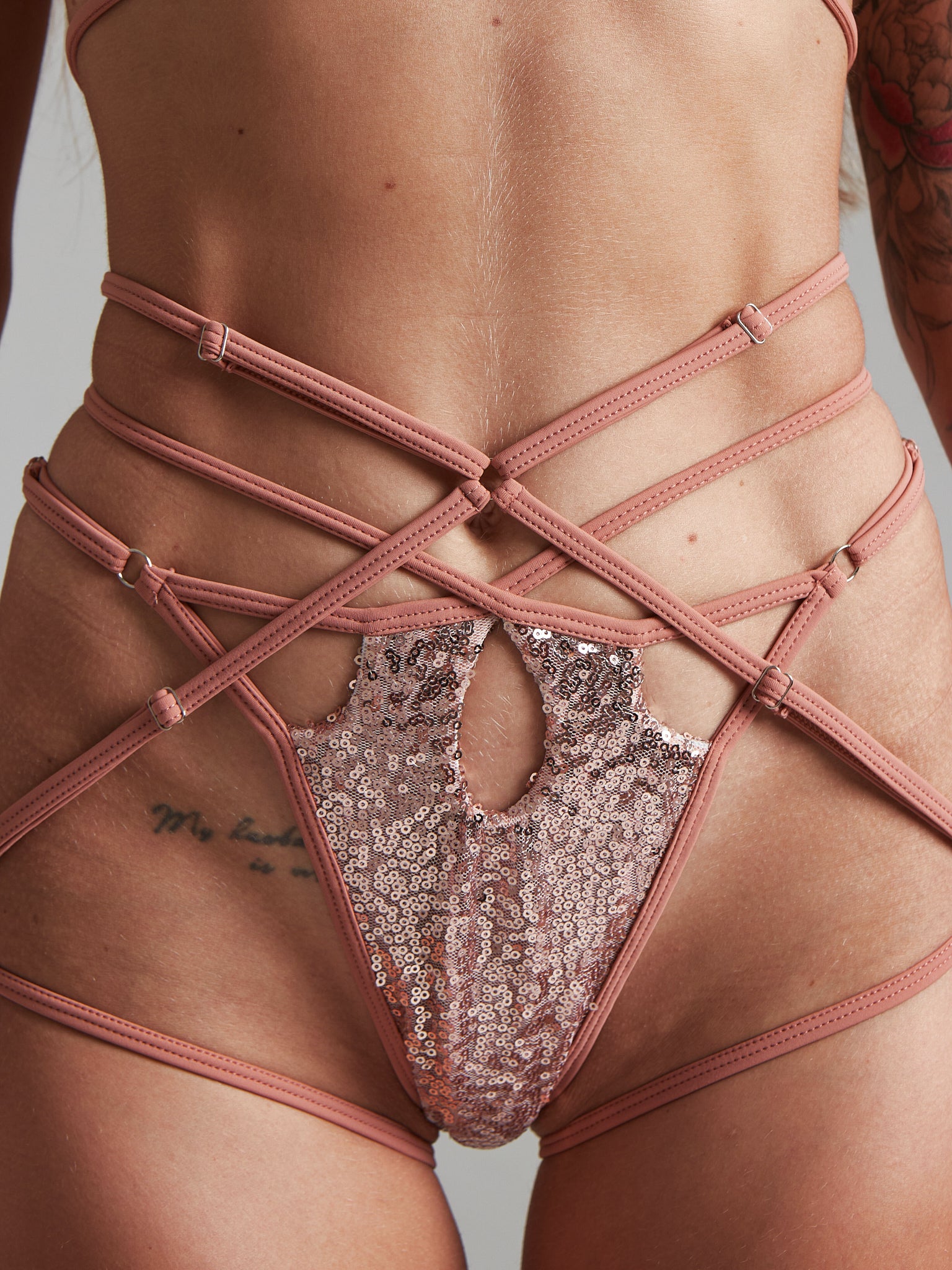 Delicate, shimmering bottoms paired with a fully adjustable belt and garters. Two pieces for a perfectly sculpted, ultra-seductive look. Soft stretch fabric, customizable fit, unforgettable sparkle — made for movement, performance and confidence. For oldschool, hardstyle and exo dancing babies.